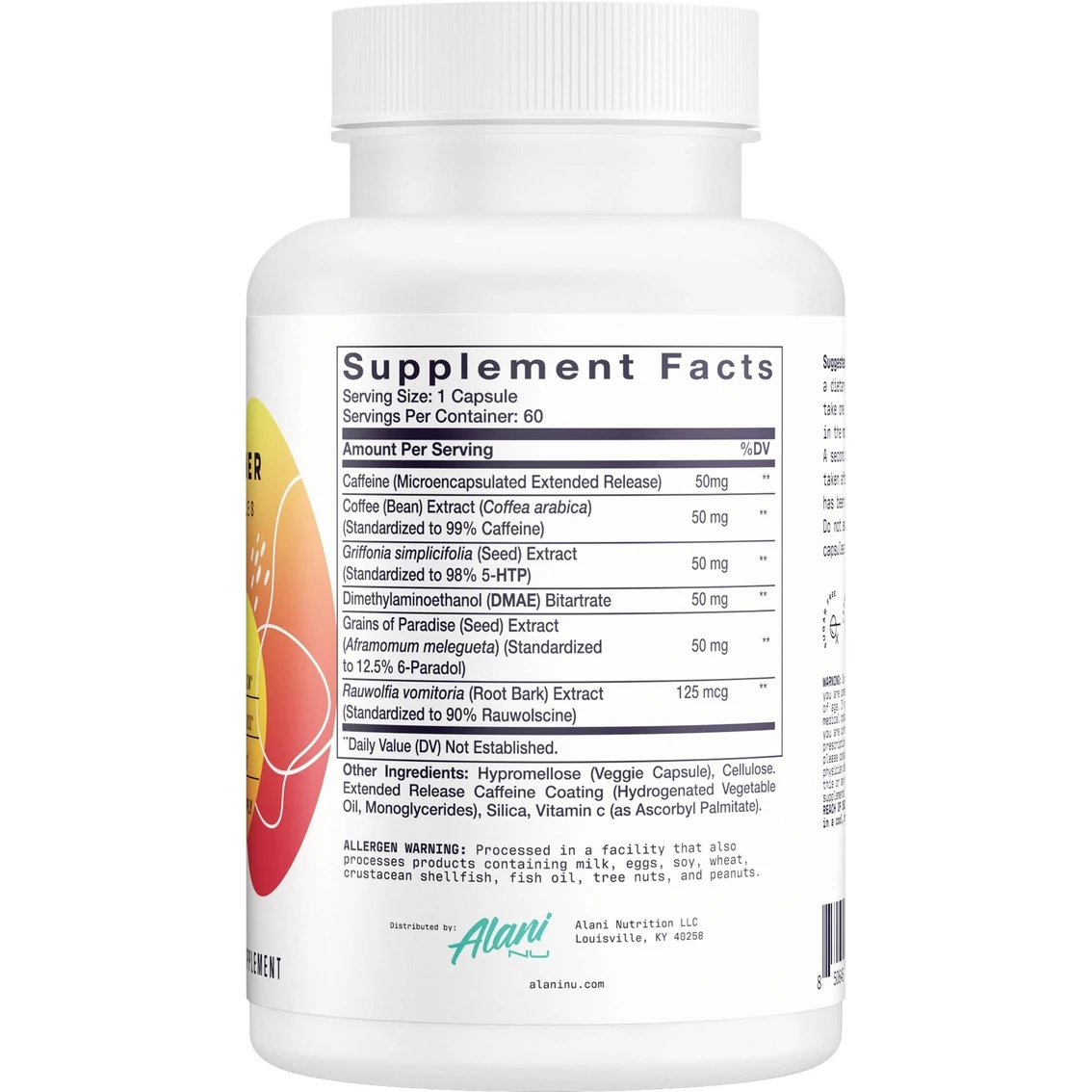 | Supplement Facts | 76.5 milligrams of extended release caffeine, 50 milligrams of coffee arabica, 50 milligrams of 5-htp, 50 milligrams of dimethylaminoethanol (DMAE), 50 miligrams of Grains of paradise, 125 milligrams of rauwolscine |