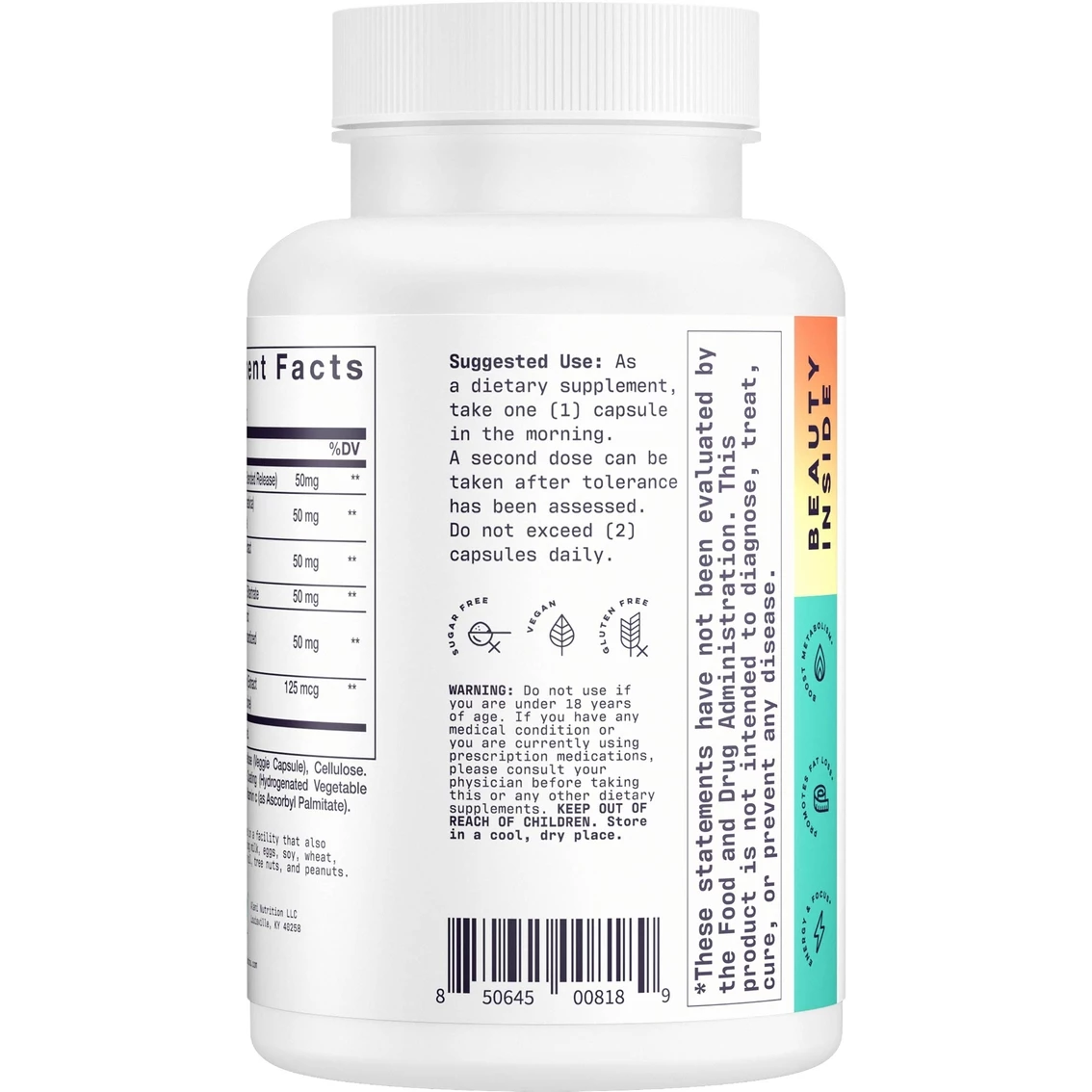 | Ingredients | Hypromellose (Veggie Capsule), Cellulose, ER Caffeine Coating (Hydrogenated Vegetable Oil, Monoglycerides), Vitamin C (as ascorbyl palmitate), Titanium Dioxide |
