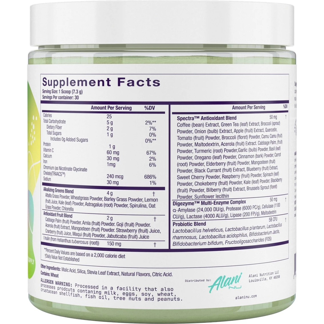 | Supplement Facts | 240 mcg of Chromium, 4 grams of Greens proprietary blend, 2 grams of Fruits proprietary blend, 50 mg of Digestive Enzyme blend, and 5 billion CFU of a Probiotic Blend |