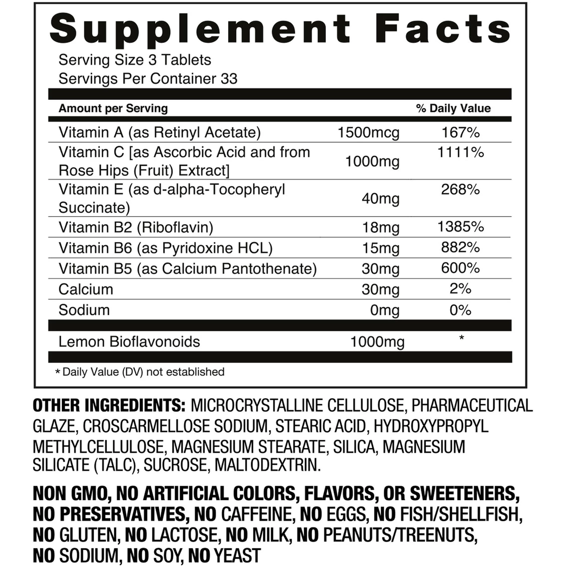 Contains 1000 mg of Bioflavonoids along with Vitamins A, B2, B5, C, E and Calcium. This product is Gluten free, caffeine free, sodium free; No artificial flavors, colors, sweeteners or preservatives; Allergen free. Manufactured in the USA