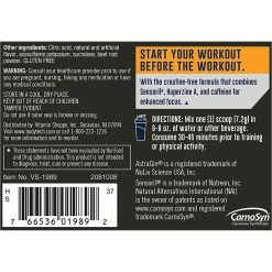 | Drug Facts | Mix one (1) scoop (7.2g) in 6-8 oz. of water or other beverage. Consume 30-45 minutes prior to training or physical activity. |