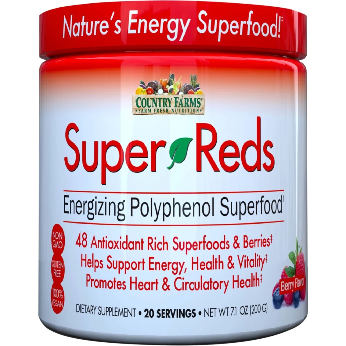 Super Reds contain 48 antioxidant-rich superfoods and berries. Boosts health and vitality. Promotes heart and circulatory health.