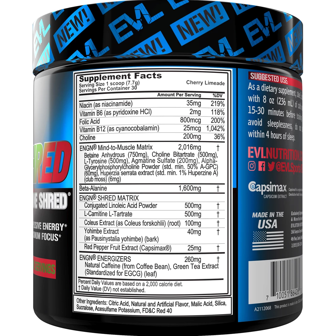 EVL ENGN SHRED revolutionary Fat Burning Pre-Workout formula is engineered to be the most complete, fully dosed thermogenic fuel that burns fat and boosts metabolism while accelerating your performance, energy, power and focus. Plus, it’s formulated to avoid the crash of other pre-workouts in a clean formula with zero sugar, zero carbs and zero calories. Achieve more with ENGN SHRED to fuel your results and lean body goals!