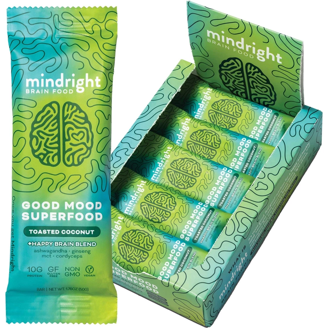 Enjoy Mindright Nootropic Infused Toasted Coconut Protein Bars. Improve your mood, energy and focus with Mindrightβs Good Mood Superfood vegan protein bar! These flavorful vegan protein bars are powered by the +Happy Brain Blend, a proprietary blend of all-natural and non-GMO brain boosting antioxidants, adaptogens, and nootropics to support a happy and healthy mind.